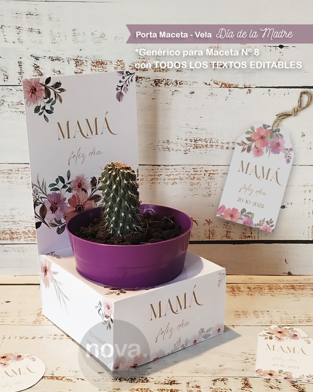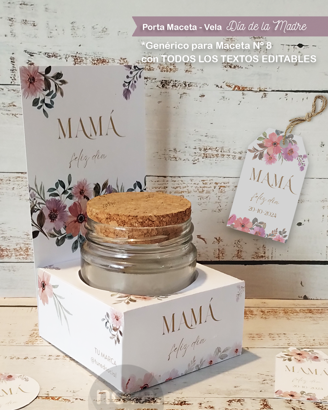 . CAJA PORTA MACETA NRO 8 Y VELA (69 mm diámetro) para imprimir en A4 con 2 hojas con TODOS LOS TEXTOS EDITABLES