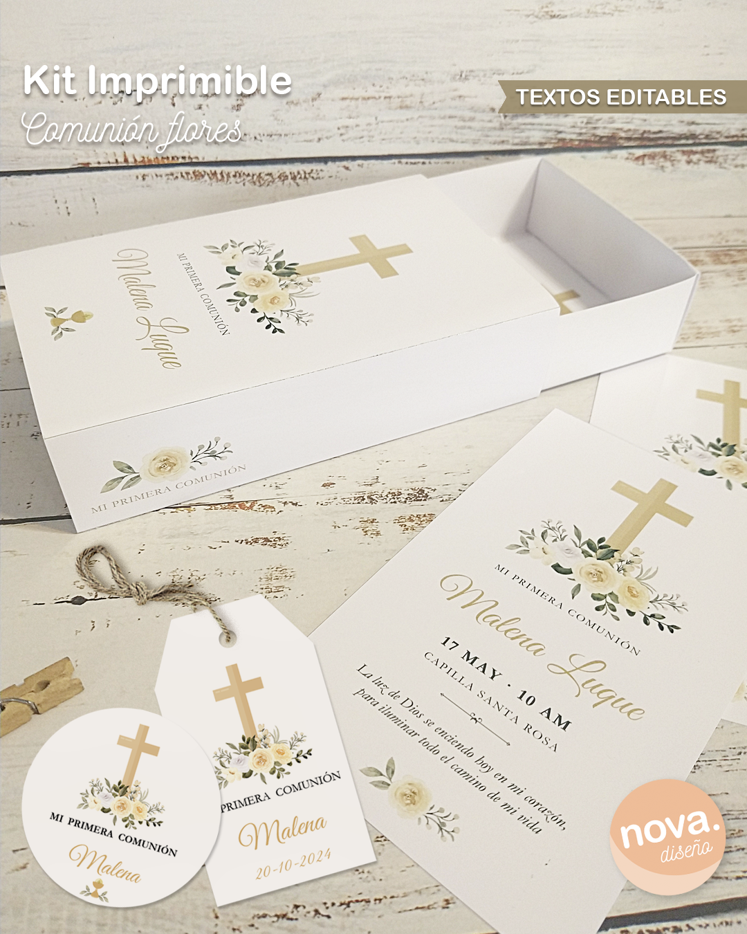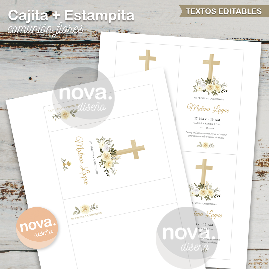 Kit Imprimible Estampitas Comunión Flores + Caja + Etiquetas TODOS LOS TEXTOS EDITABLES