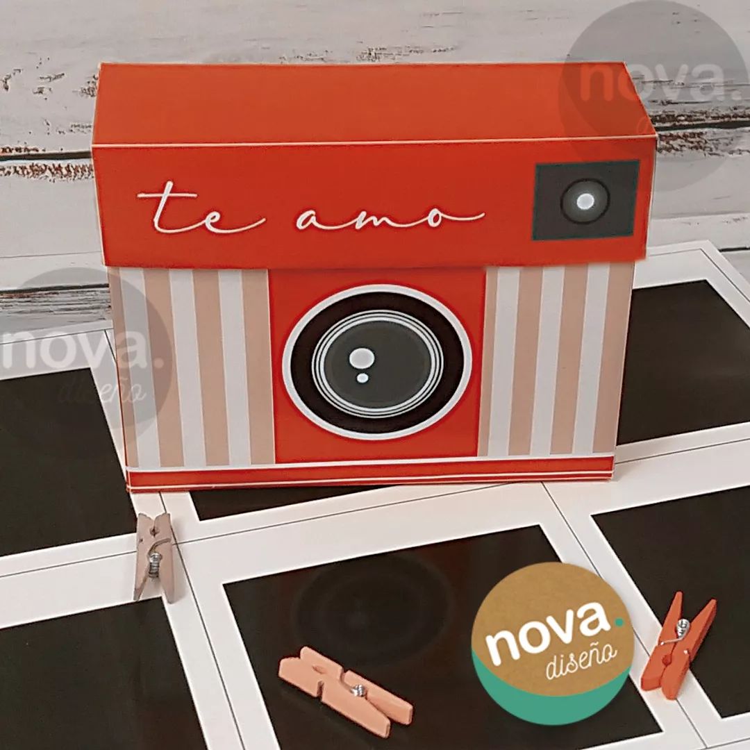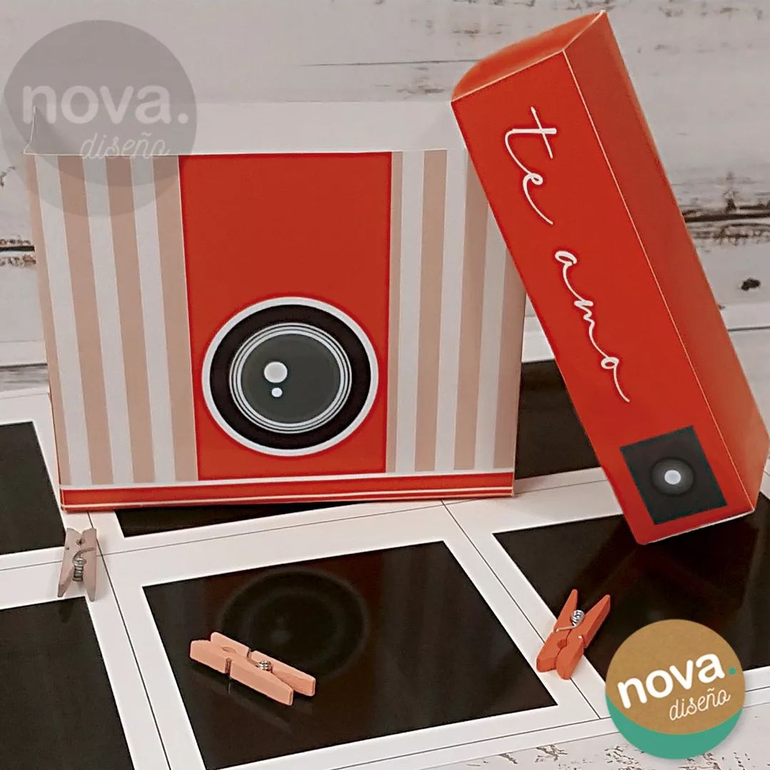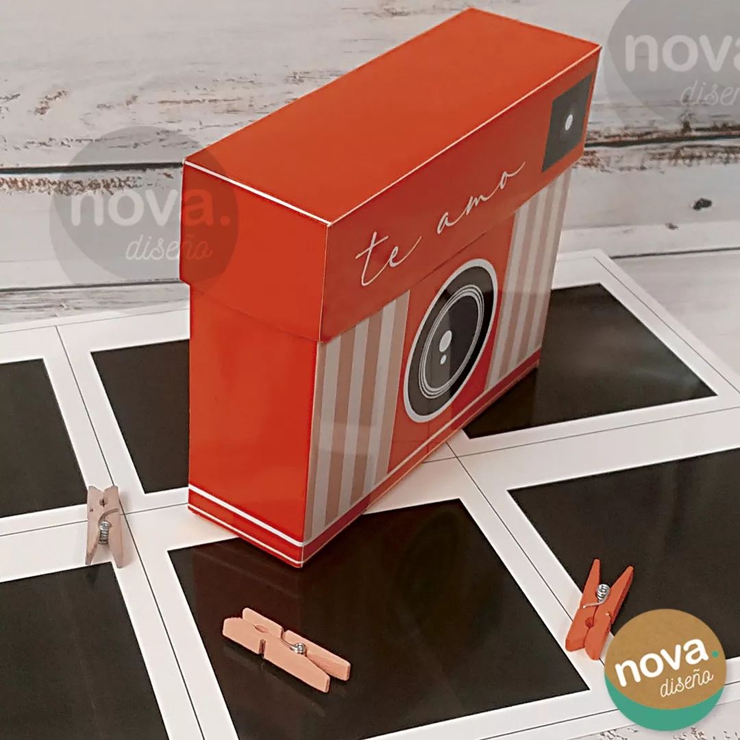 . Cajita Cámara Intax 12,5x10x3,7 cm. Imprimible en 2 hojas A4, una para la caja y otra para la tapa. Con espacio para agregar bombones, bijou, etc.